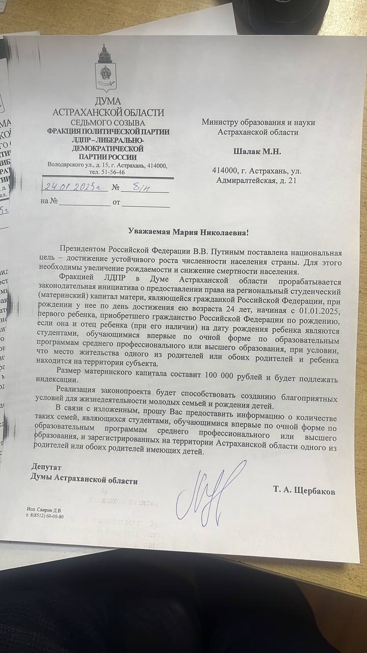 В связи с Днем студента предлагаю ввести студенческий материнский капитал на территории Астраханской области! Владимир Жириновский с момента основания ЛДПР твердил, что нужно срочно задуматься о демографии. Поэтому предлагаю сделать региональный студенческий материнский капитал в размере 100 000 руб для девушек, родивших до достижения 24 лет, и являющихся вместе с мужем студентами очного отделения. Подробности моей инициативы читайте в моем письме Министру образования региона».