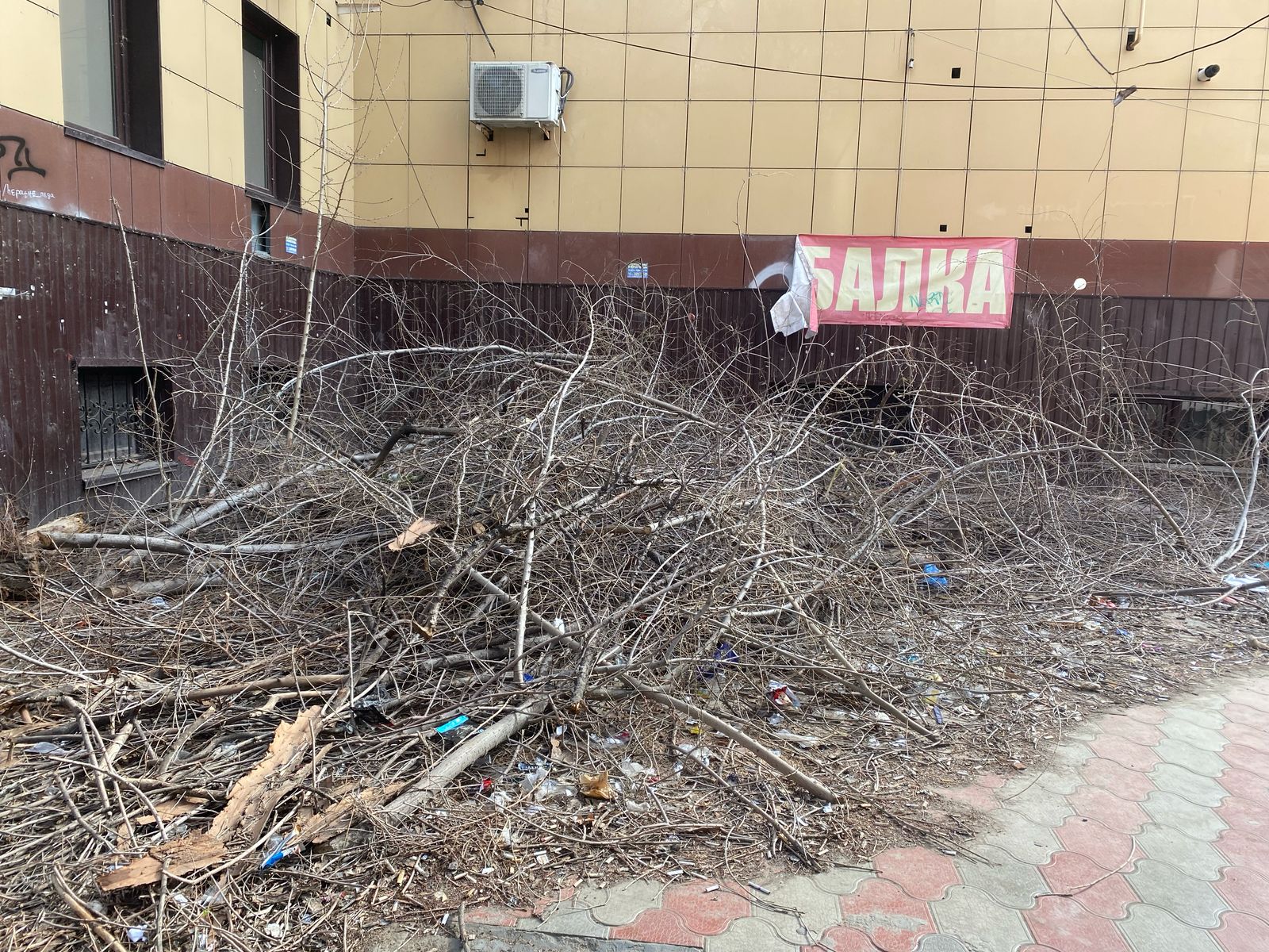 Еще одна свалка находится недалеко от остановки «Призыв», расположенной на улице Савушкина. В данном случае мы наблюдаем не пакеты с отходами, а большое количество веток, которые, забыли вывезти.