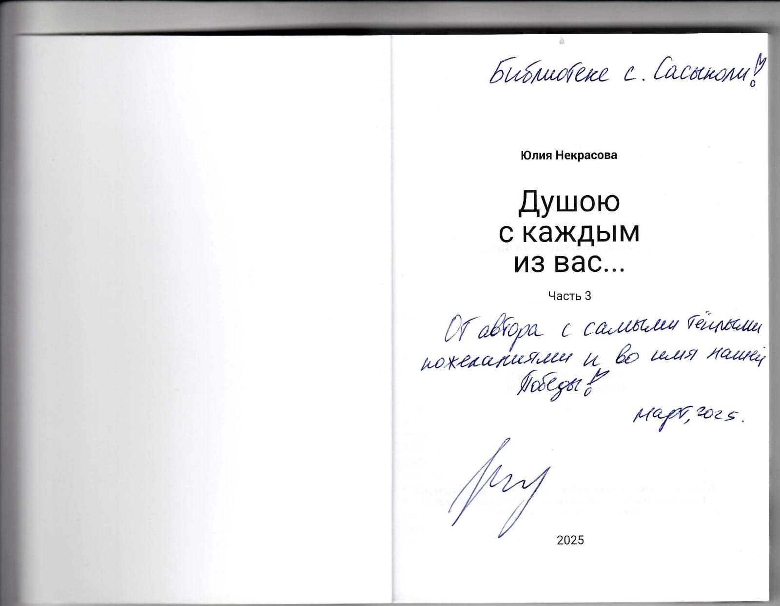 В фонде библиотеки села Сасыколи Харабалинского района пополнение. Благодаря координатору Харабалинского местного отделения ЛДПР, волонтеру Марине Коноплевой в указанной библиотеке появился третий сборник патриотических стихотворений Юлии Некрасовой под названием «Душою с каждым из вас...»