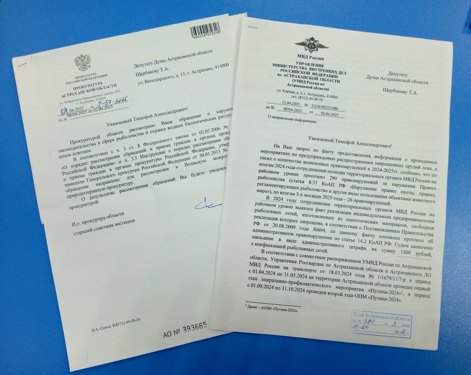 После чего парламентарием были направлены обращения в Прокуратуру области, а также региональное УМВД. В них лидер астраханской ЛДПР просил предоставить информацию о мероприятиях, проводимых для предупреждения распространения запрещённых орудий лова, а также о количестве уже выявленных правонарушений в 2024-2025-х годах.