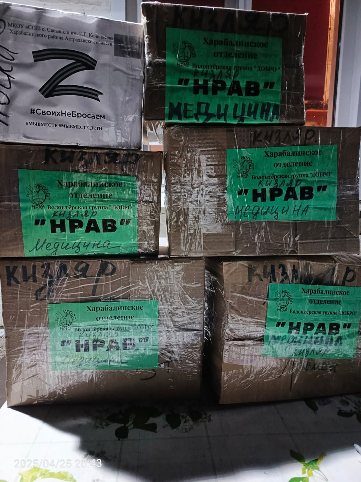 Сбор на медикаменты для прифронтового госпиталя прошел в селе Сасыколи Харабалинского района. Несколько коробок лекарственных препаратов на сумму более 27 тысяч рублей отправились в военное медучреждение