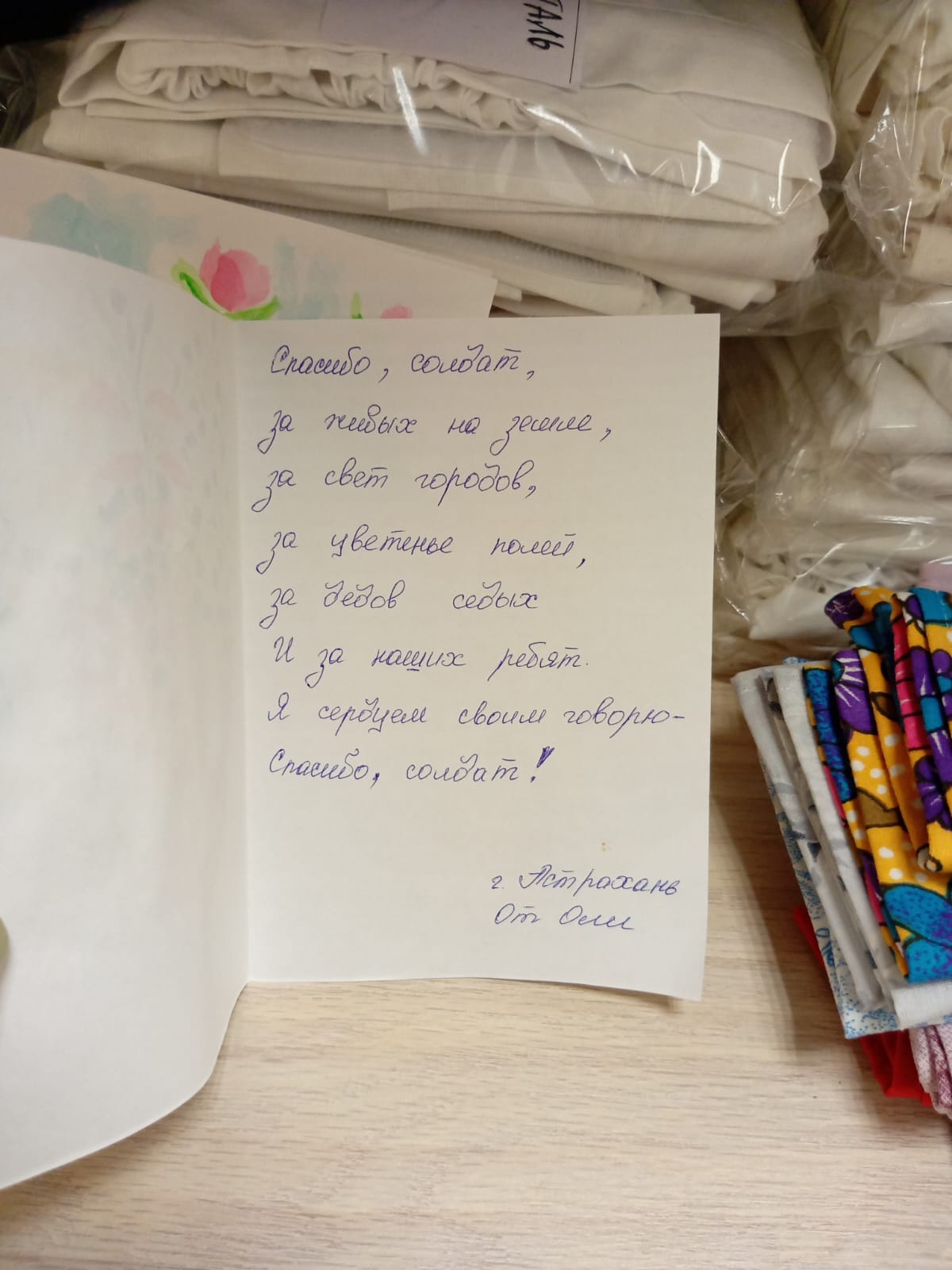 «Нас объединила идея помочь, поддержать ребят, чтобы приблизить нашу общую победу. Сейчас в движении задействовано около 30 швей и 50 добрых помощников. Те, кто не умеют шить, но хотят внести свой вклад в общее дело, покупают конфеты, сладости, влажные салфетки, а также подписывают открытки», - продолжает Ангелина Калашникова.
