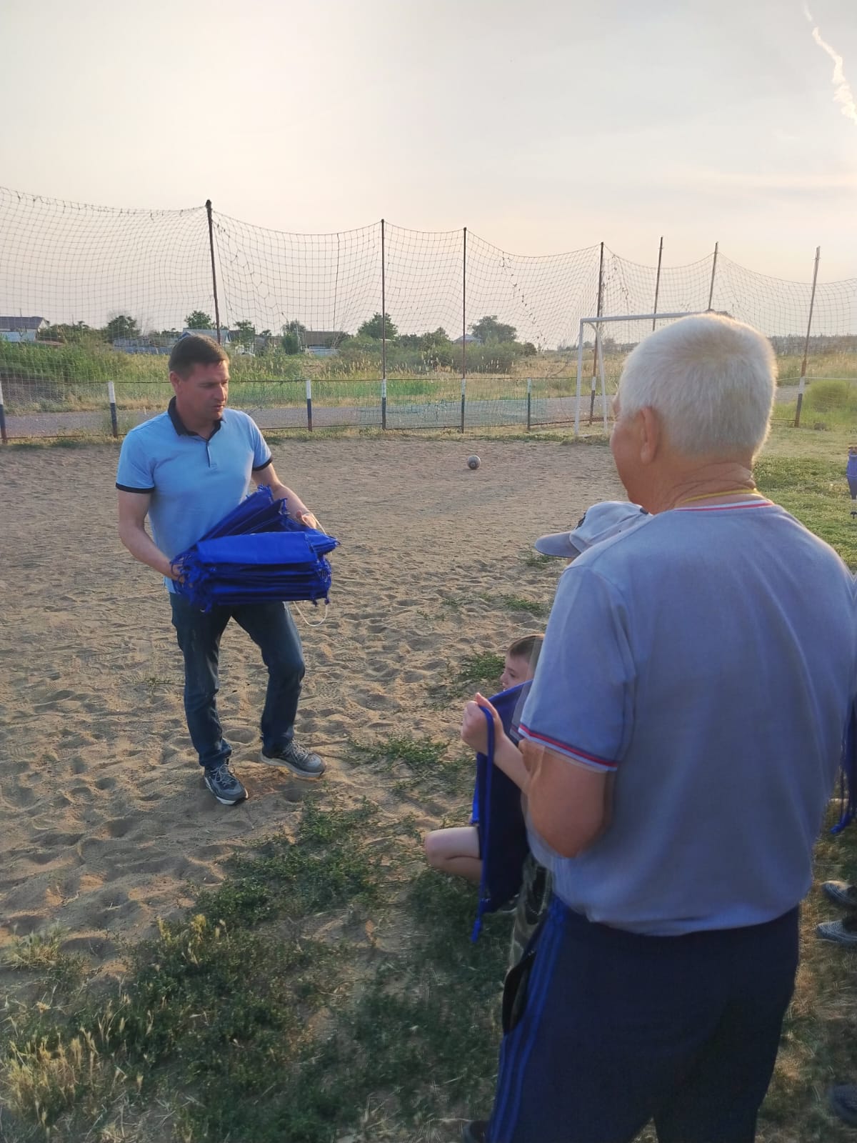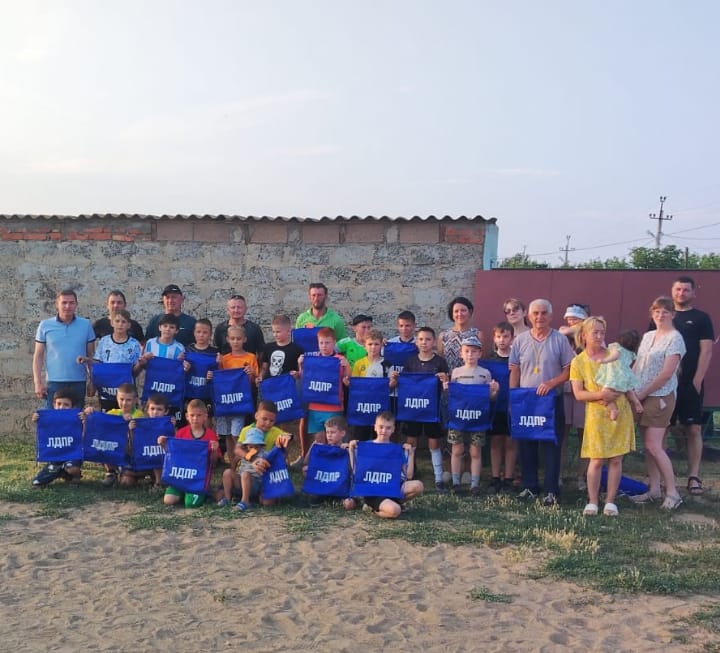 Тимофей Щербаков поддержал юных футболистов и в качестве поощрения вручил сувениры с партийной символикой — сумки для второй обуви.