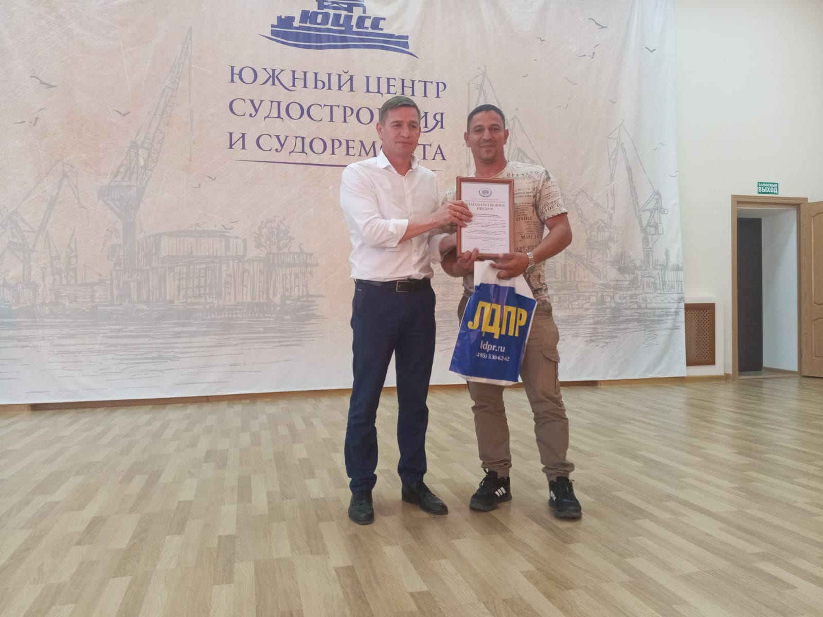 Тимофей Щербаков выразил признательность судостроителям за профессионализм и преданность выбранному делу, за вклад в повышение технологического развития производства и вручил 15 сотрудникам ЮЦСС и ССЗ «Лотос» благодарственные письма и памятные подарки от партии.