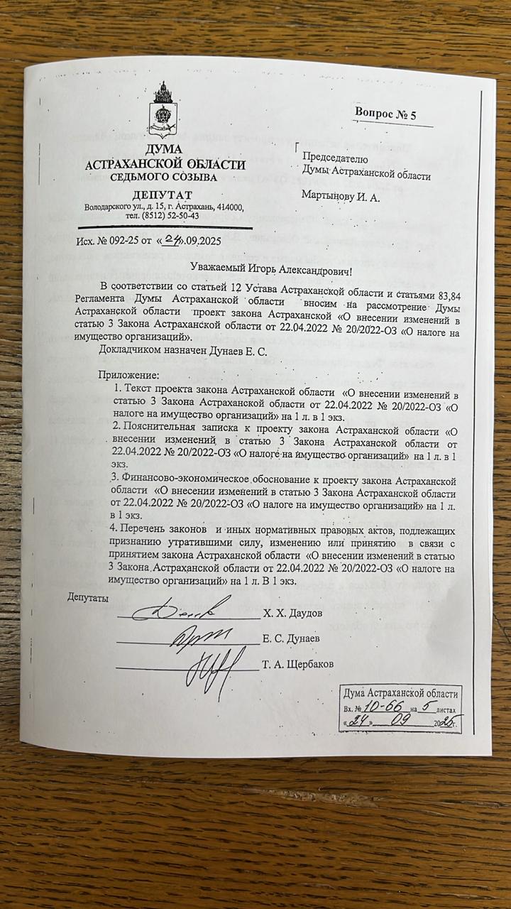 Завтра, 6 ноября 2025 года, на заседании Думы Астраханской области будет рассмотрен законопроект, инициированный депутатами регионального парламента Тимофеем Щербаковым, Хамзатом Даудовым и Евгением Дунаевым «О внесении изменений в статью 3 Закона Астраханской области от 22.04.2022 № 20/2022-ОЗ «О налоге на имущество организаций».