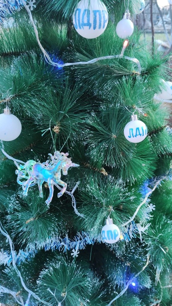 Ее главное отличие от "соперниц" - оригинальный, дизайнерский наряд. Его для елки подобрала Марина Коноплева. Символ нового года одет в игрушки белого цвета. Есть и крупные и мелкие, но главная изюминка - это собственноручно нанесенный на них логотип ЛДПР - синими буквами.