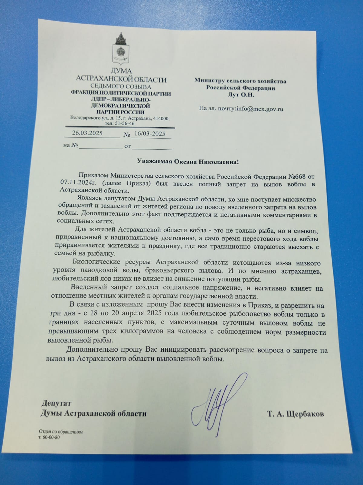 Руководитель Астраханского регионального отделения ЛДПР, депутат Думы Астраханской области Тимофей Щербаков направил официальное обращение Министру сельского хозяйства РФ Оксане Лут